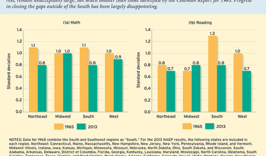 Eric A. Hanushek of the Hoover Institution at Stanford University has written a new article about one of the findings of the report: the existence of large achievement disparities across races and regions within the United States. For instance, Coleman found that in 1965, the average black 12th grader in the rural South registered an achievement level that was comparable to that of a white 7th grader in the urban Northeast.