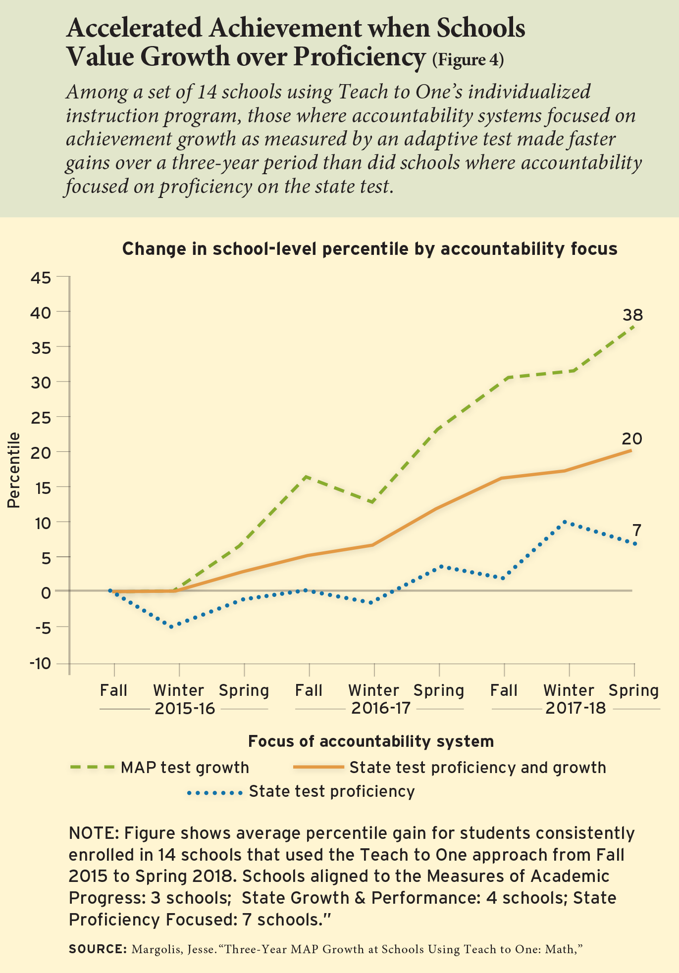 What can happen when schools make a clear choice to prioritize learning growth over grade-level exposure? A 2019 study looking at progress on the Measures of Academic Progress assessment compared the growth of Teach to One students at 14 schools over three years to national averages. It found that Teach to One schools whose accountability systems focused on growth made stronger gains than schools whose accountability systems focused on proficiency (see Figure 4). The study also found suggestive evidence that schools tended to see stronger gains when the math content presented to students matched their tested grade level from the beginning of the year.