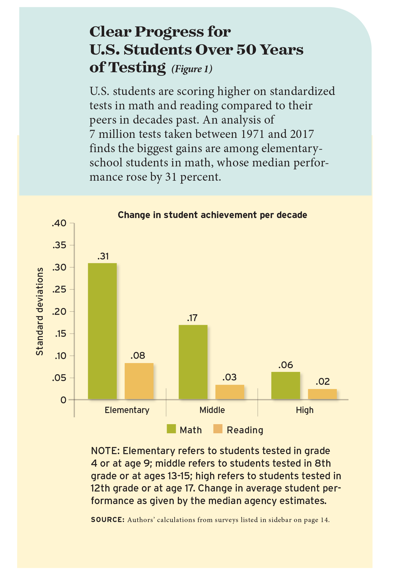 These and similar questions provoke near-constant conversation. But answers are uncertain, partly because research to date has yielded inconsistent findings. Here we bring together information from every nationally representative testing program consistently administered in the United States over the past 50 years to document trends in student achievement from 1971 to 2017, the last year for which detailed information is currently available.