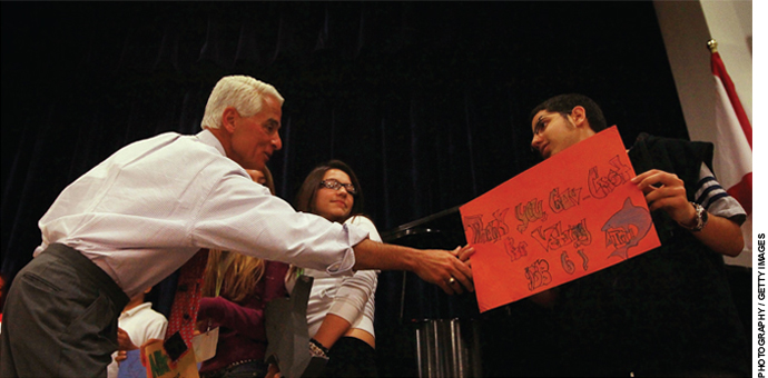 When the Florida legislature, on April 8th, passed a bill that sought to replace teacher tenure with merit pay, the Florida Education Association (FEA) sprang into action, organizing members and community activists to lobby Governor Charlie Crist to veto the measure. FEA, with the help of its parent union, the National Education Association (NEA), generated thousands of e-mails, letters, phone calls, and Internet posts in opposition to the legislation. When Governor Crist delivered his veto on April 15th, the union ran television and Internet ads, thanking him. A few weeks later, FEA gave a much-needed boost to Crist’s independent bid for a U.S. Senate seat by endorsing both Crist and Democratic candidate Kendrick Meek.
