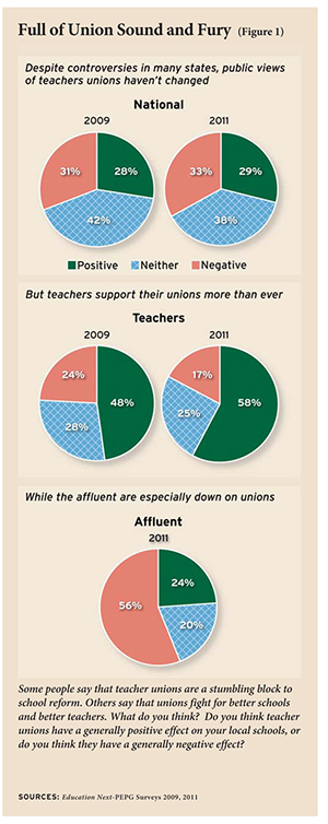Teachers Unions. When asked whether teachers unions have a generally positive or negative effect on the nation’s public schools, 33 percent of the public gives a negative response, virtually unchanged from the 31 percent and 33 percent who perceived a negative impact in 2009 and 2010, respectively (see Figure 1). The share perceiving a positive union impact on schools hardly budged, changing only from 28 percent in 2009 to 29 percent in 2011. A sizable plurality of 38 percent continues to hold a neutral position, suggesting that the debate over the role of teachers unions is hardly over. The views about teachers unions held by the affluent are more negative, with no less than 56 percent saying unions have a negative impact on their schools.