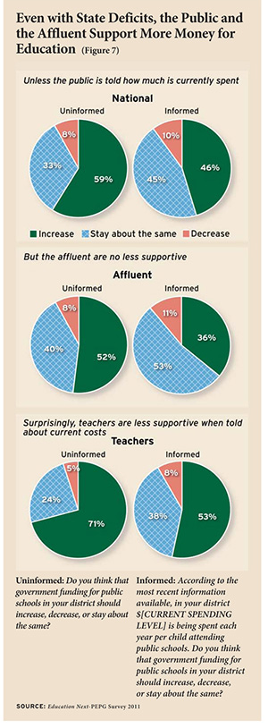 These are among the questions we explore in this, the fifth-annual Education Next–PEPG Survey, which interviewed a nationally representative sample of some 2,600 American citizens during April and May of 2011 (see sidebar for survey methodology). In addition to the views of the public as a whole, we pay special attention in this year’s survey to two potentially influential types of participants in school politics: the affluent and teachers. To our knowledge, this is the first survey of a nationally representative sample of affluent Americans, defined as college graduates who are in the top income decile in their state. This is the third year we have surveyed a nationally representative sample of teachers, defined as full-time teachers currently working in public schools. Both the affluent and teachers pay more attention to public education and participate more actively in school politics than the general public, making their views worthy of close scrutiny (see sidebar).