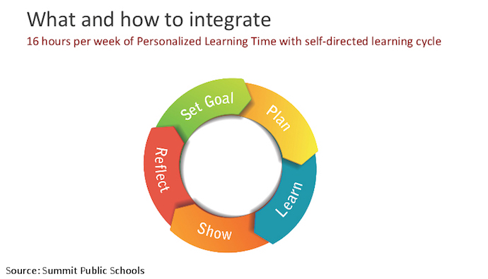 1. Student agency. Summit believes that for students to feel successful and make progress every day, one essential element is empowering them to set individual learning goals for their own personal learning plans and then providing them with enough time and the right processes each day to make progress toward those individualized goals. Faculty believe students need to experience making personal decisions about the direction of their learning and choosing from multiple options to learn the required concepts. Summit even extends this to incorporating student feedback into improving its school design and asking students to rate the menu of lessons its teachers develop.