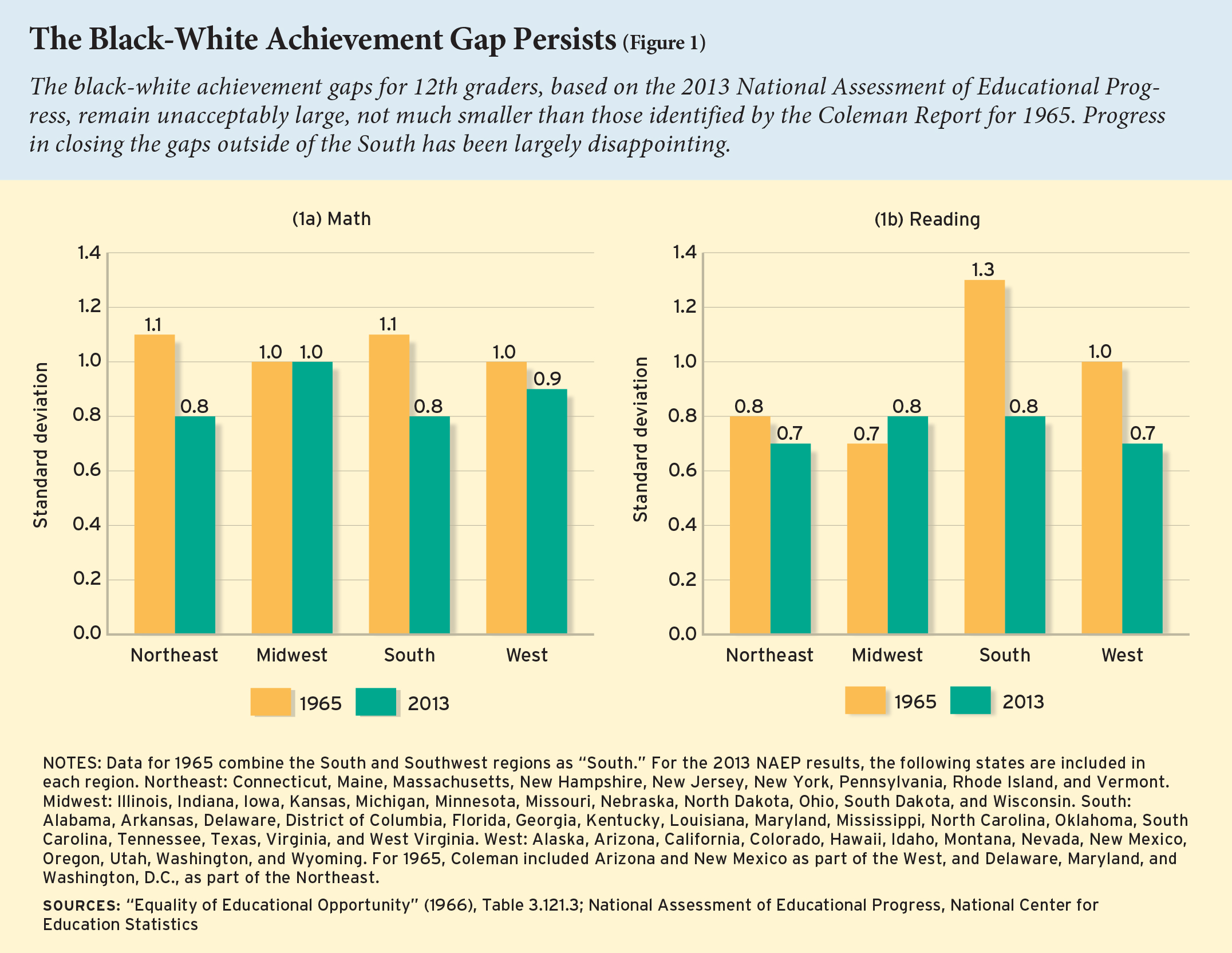 As Figure 1 shows, the largest gains in both math and reading were found in the South, where the larger gaps observed in 1965 were brought in line with the rest of the nation by 2013. But the generally slow improvements in much of the rest of the country, including an expanded reading gap in the Midwest, attenuated the overall improvement.