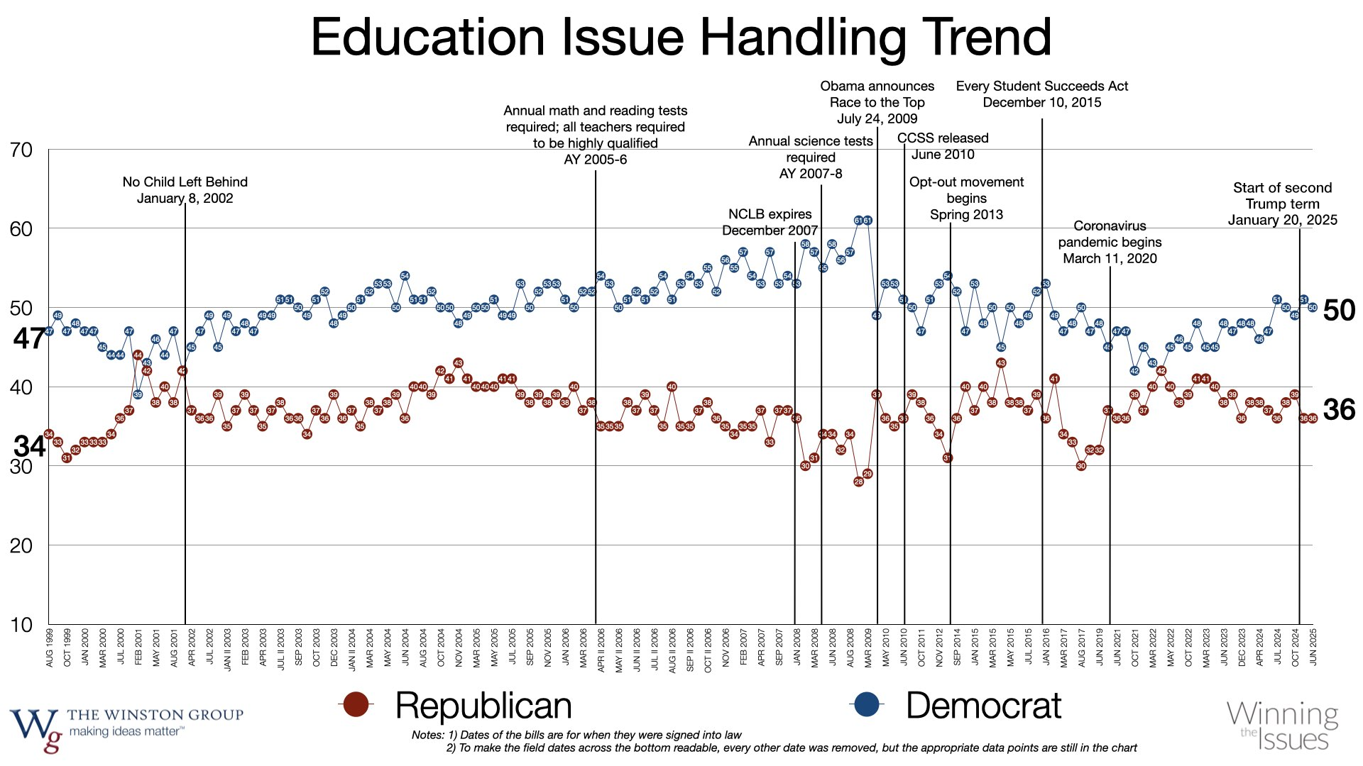 First, the way a survey question is worded can and does have a bearing on the results. At The Winston Group, we ask voters which party they have more confidence in to handle education. But both DFER surveys asked voters who they trust to handle the issue, and their 2023 survey primed voters to focus specifically on matters of academic preparation: “Which party do you trust more to handle issues related to schools and education?” (2022) and “Regardless of how you usually vote, which political party, the Democrats or the Republicans, do you trust to do a better job making sure public schools are preparing students for success after high school by ensuring they are teaching students to read and do math well?” (2023). Blue Rose Research, which has also found a small Republican advantage on education in surveys of registered voters through February 2025, also appears to ask the question in terms of trust.