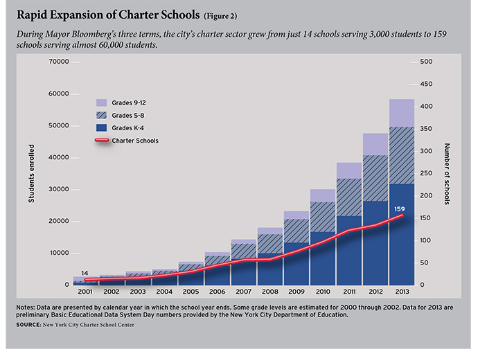 A new report by Grover “Russ” Whitehurst and the Brown Center on Education Policy at the Brookings Institution says that the “expansion of school choice and school competition” has been a “prominent dimension of change” since Bloomberg won control of the schools in 2002. (De Blasio says he supports mayoral control.) Using their new authority, Bloomberg and Klein “dramatically” expanded the “availability of alternatives” to failing public schools, increasing charters from 14 schools to 159 during Bloomberg’s three terms, closing failing schools, and making almost all of the city’s high schools “schools of choice” (see Figure 2).